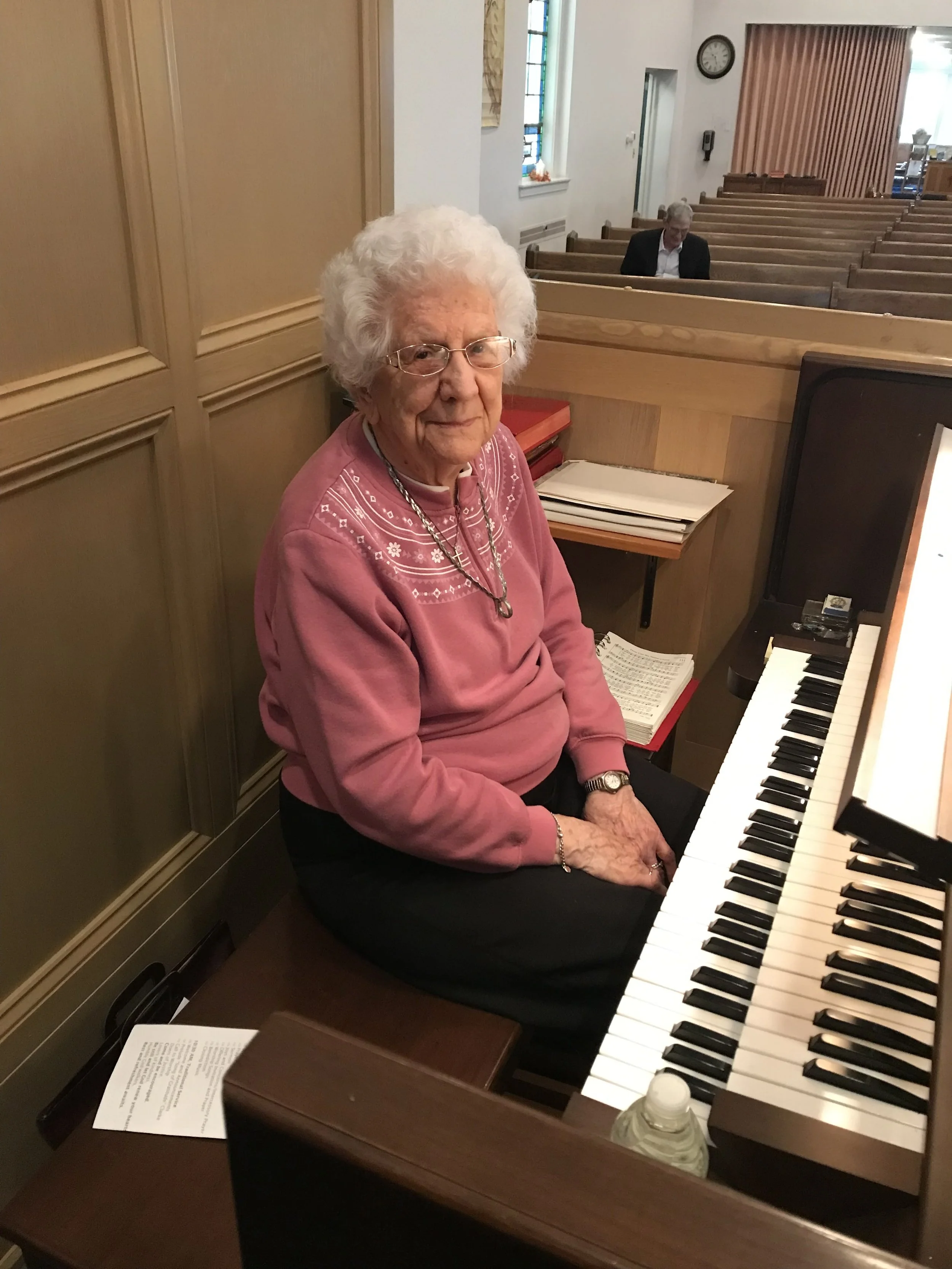 Bernice "Bernie" Mease lives on the outer edge of Lebanon City and is the mother to two daughters, Brenda and Melanie. Bernie began her career as organist at KUMC August 1, 1964, and this past August celebrated 60 years of service, and still counting. Bernie played the piano for 9 years prior to self-teaching herself the transition to organ.